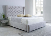 It's a perfect choice for your dream house. Our high level of craftsmanship has created this fantastic bed. This piece of furniture will leave an impression on everyone that visited your home. The Bed is Upholstered in Polyester, soft and luxurious velvet fabric. The detailing on the bed frame is outclass with a winged headboard style. The sunrise bed can be manufactured in single, double, small double, king size as well.